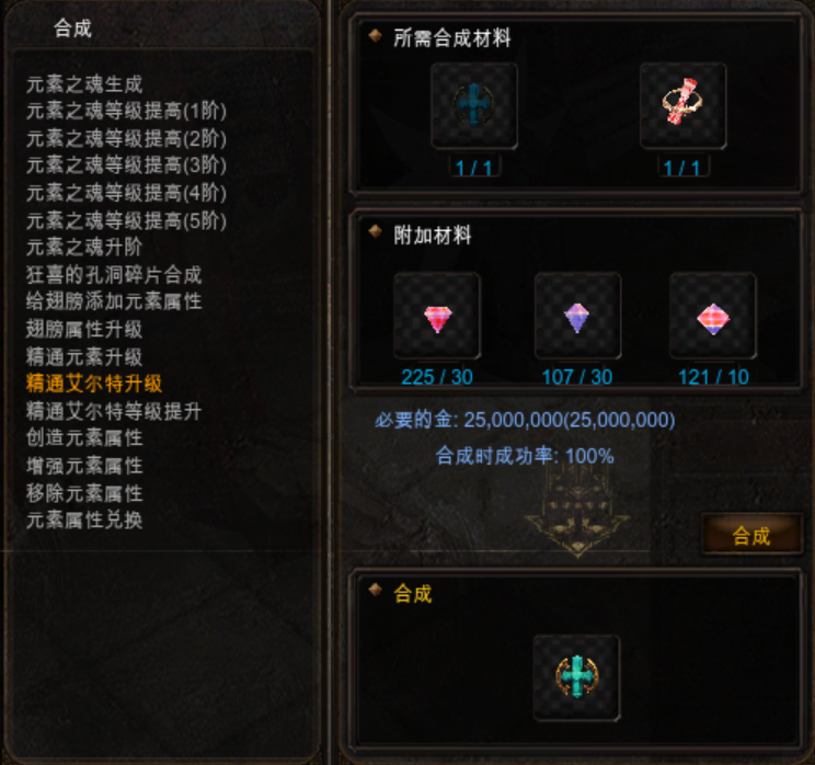 元素NPC处选择“精通艾尔特升级”,艾尔特升级成功率是100%,但是艾尔特必须为3阶才行,否则出的是垃圾。狂喜不能升级。