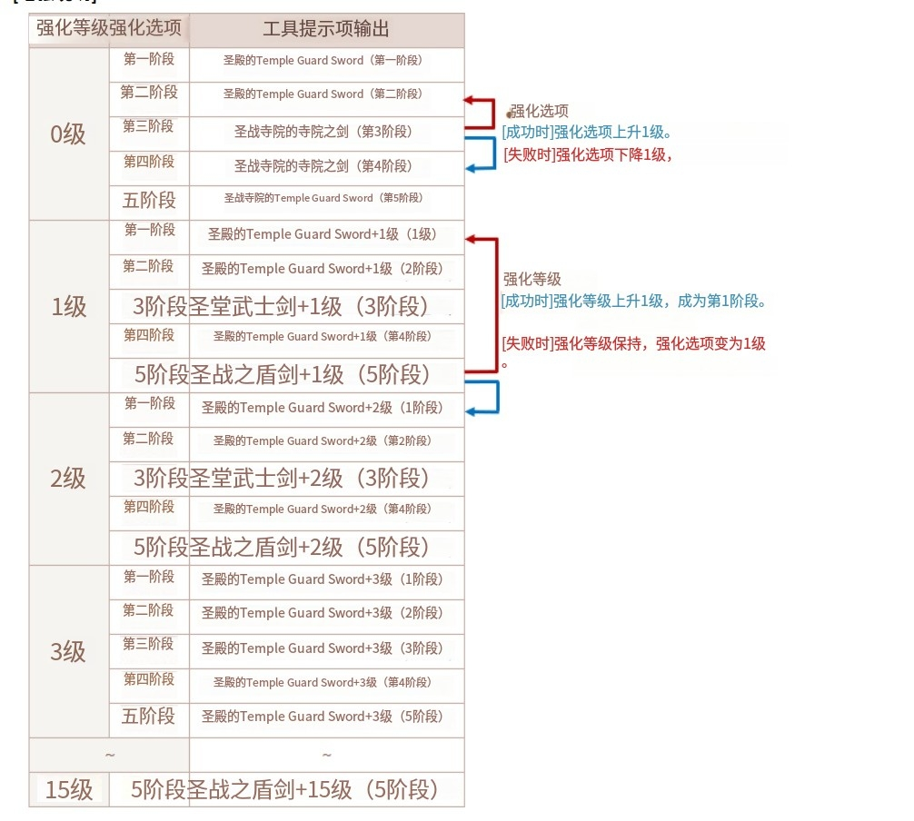 | 失败时 | 强化等级 1 被丢弃。 - 不要低于 1 级。 | ||||||||||||||||||||||